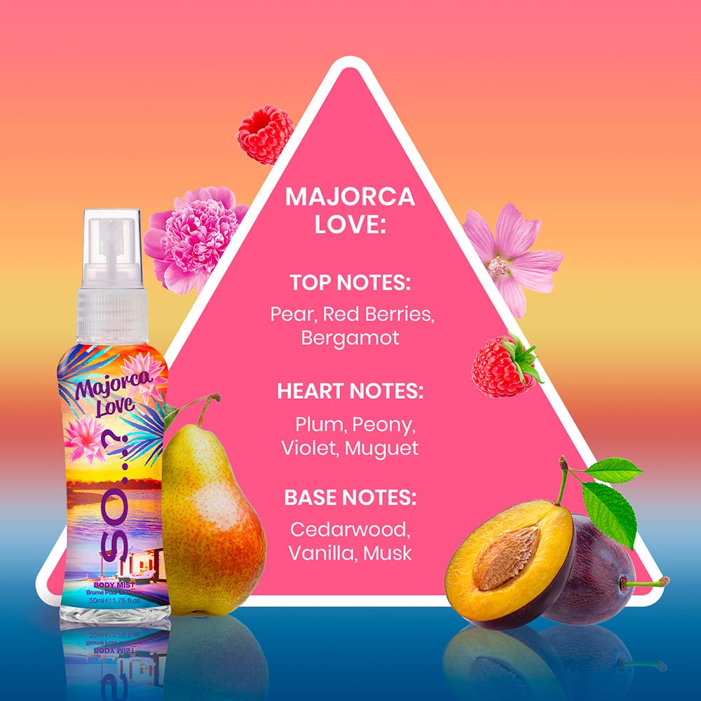 Déjate cautivar por la pasión de las islas con la bruma SO...? Majorca Love. Una fragancia vibrante y romántica que combina la frescura de las frutas con la delicadeza de las flores, diseñada para quienes buscan un aroma apasionado y lleno de vida.